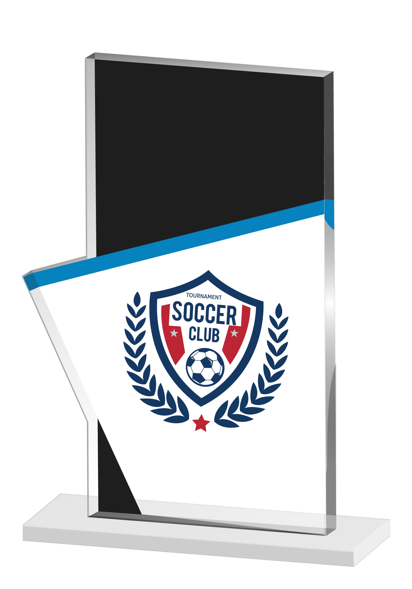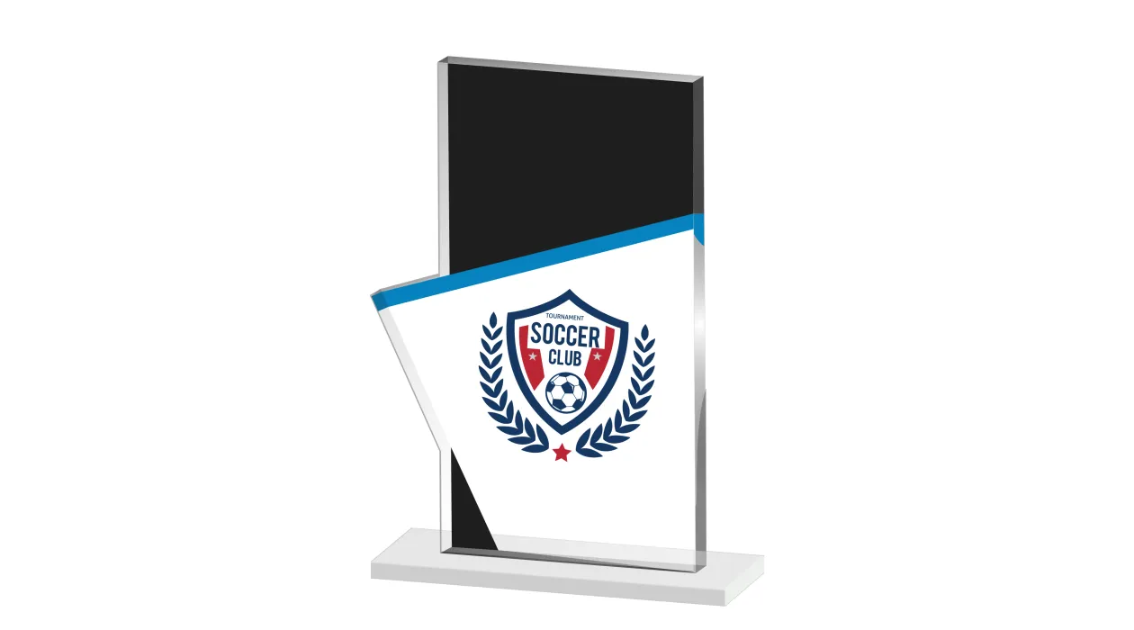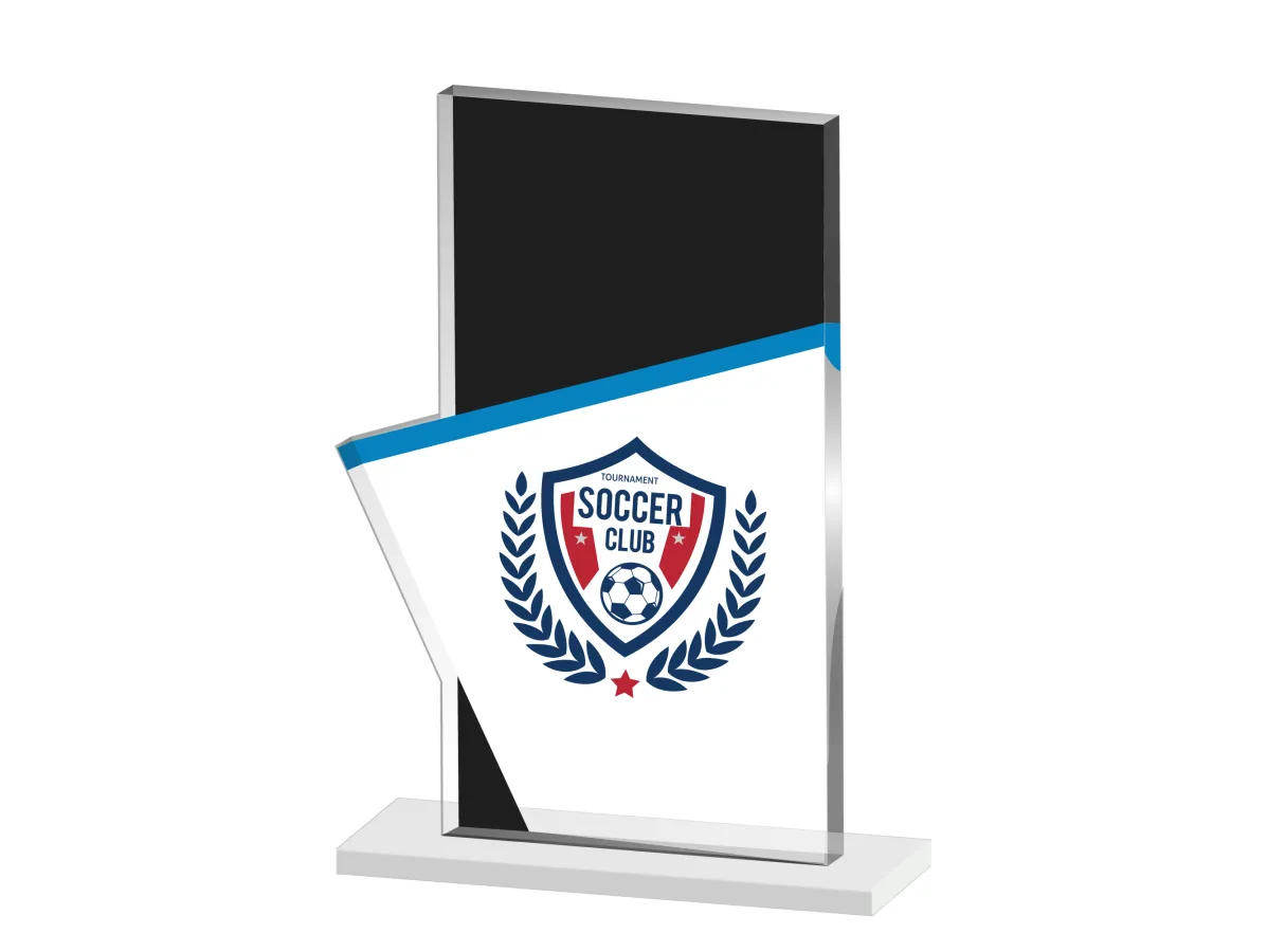 Este trofeo de metacrilato de diseño innovador y acabado en negro, azul y blanco es perfecto para premiaciones deportivas, reconocimientos empresariales y eventos especiales. Con su estilo elegante y estructura resistente, es ideal para destacar logros y celebrar éxitos.