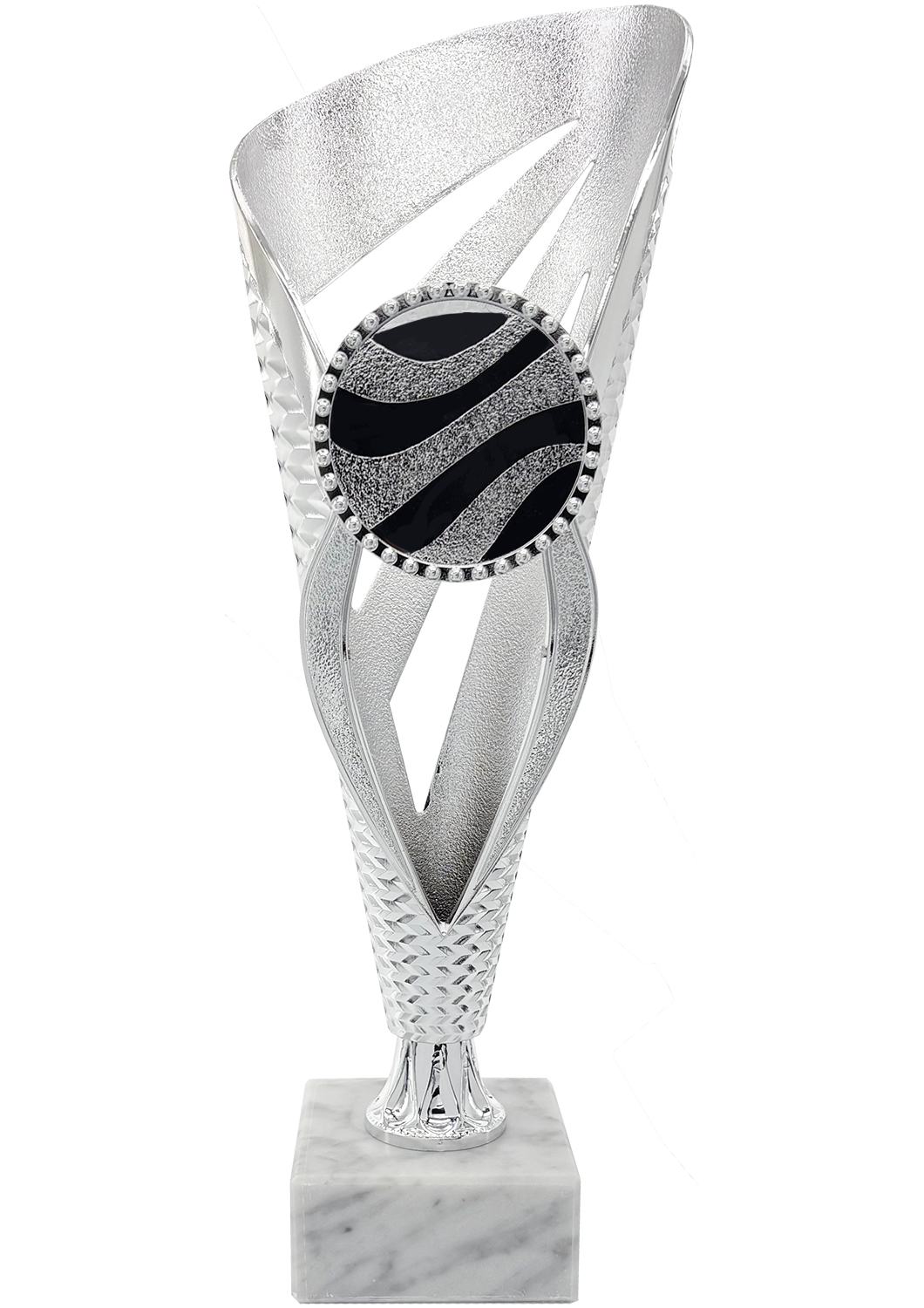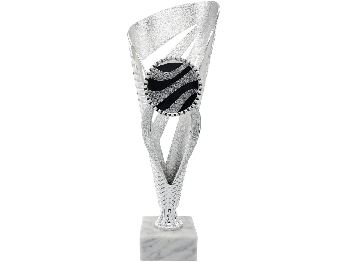 Altura imponente y diseño clásico, Acabado plateado de alto brillo, Base sólida para mayor estabilidad. Opción de personalización con texto o logotipo.