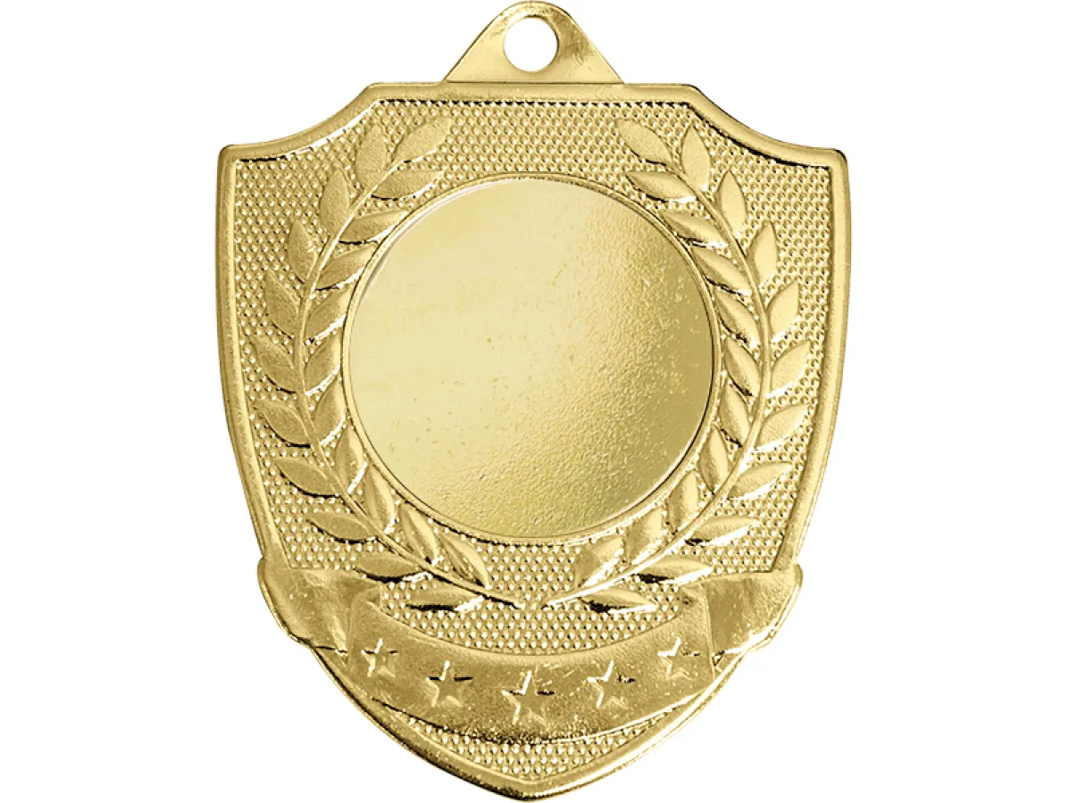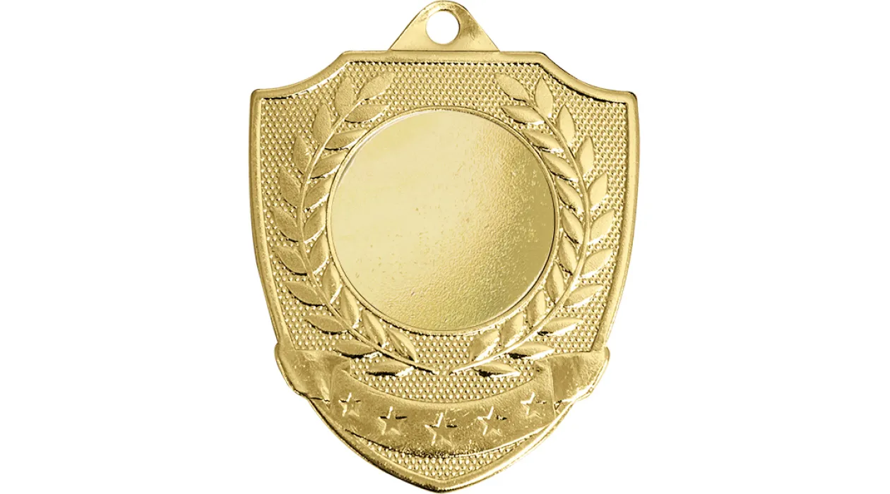 🎖 Celebra la excelencia con esta elegante medalla dorada en forma de escudo, diseñada para reconocer logros en competencias deportivas, eventos académicos y premiaciones corporativas. Su diseño incluye un laurel en relieve, símbolo de victoria y honor, además de una banda decorativa con estrellas que aporta un toque de distinción.