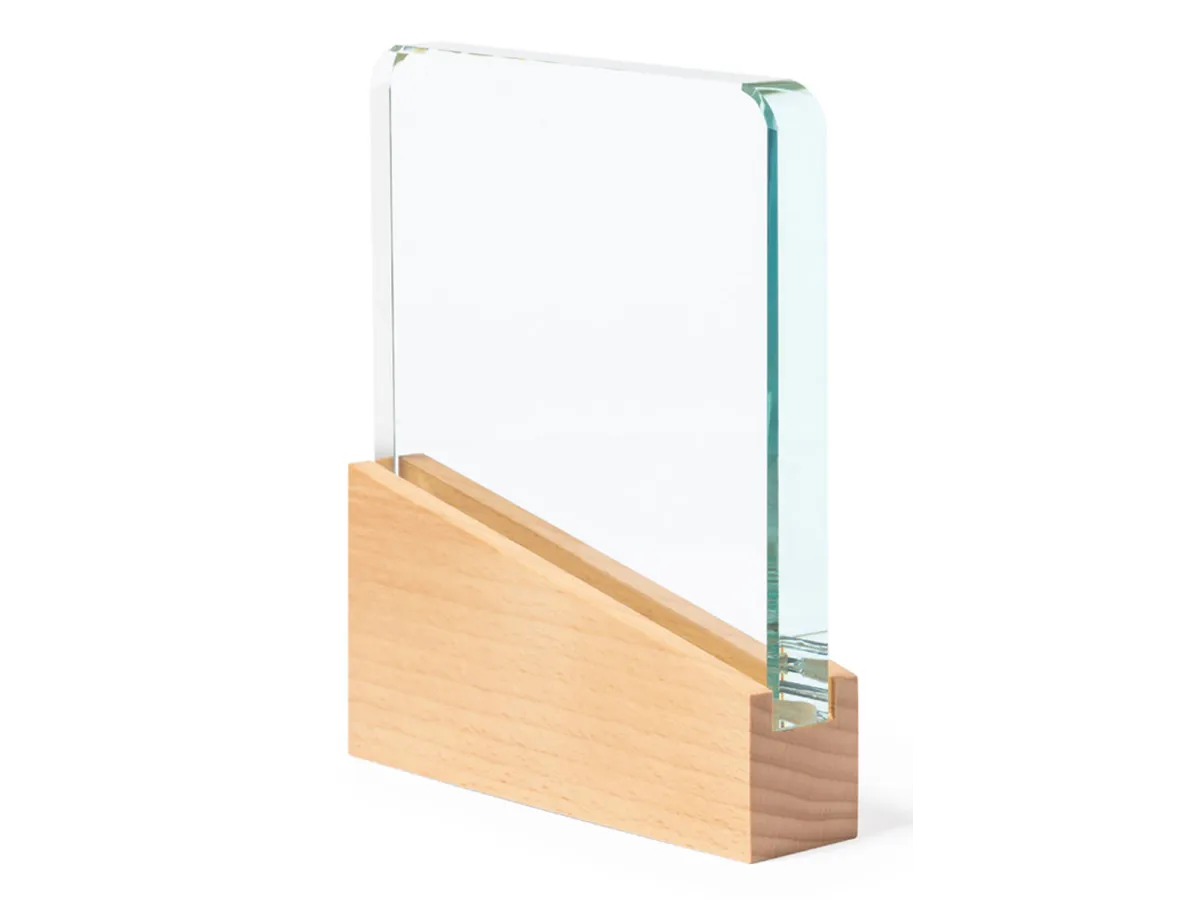 El trofeo de cristal con base de madera combina sofisticación y un estilo natural, ideal para reconocimientos empresariales, deportivos y académicos. Su diseño minimalista con materiales ecológicos lo convierte en una opción exclusiva y sostenible
