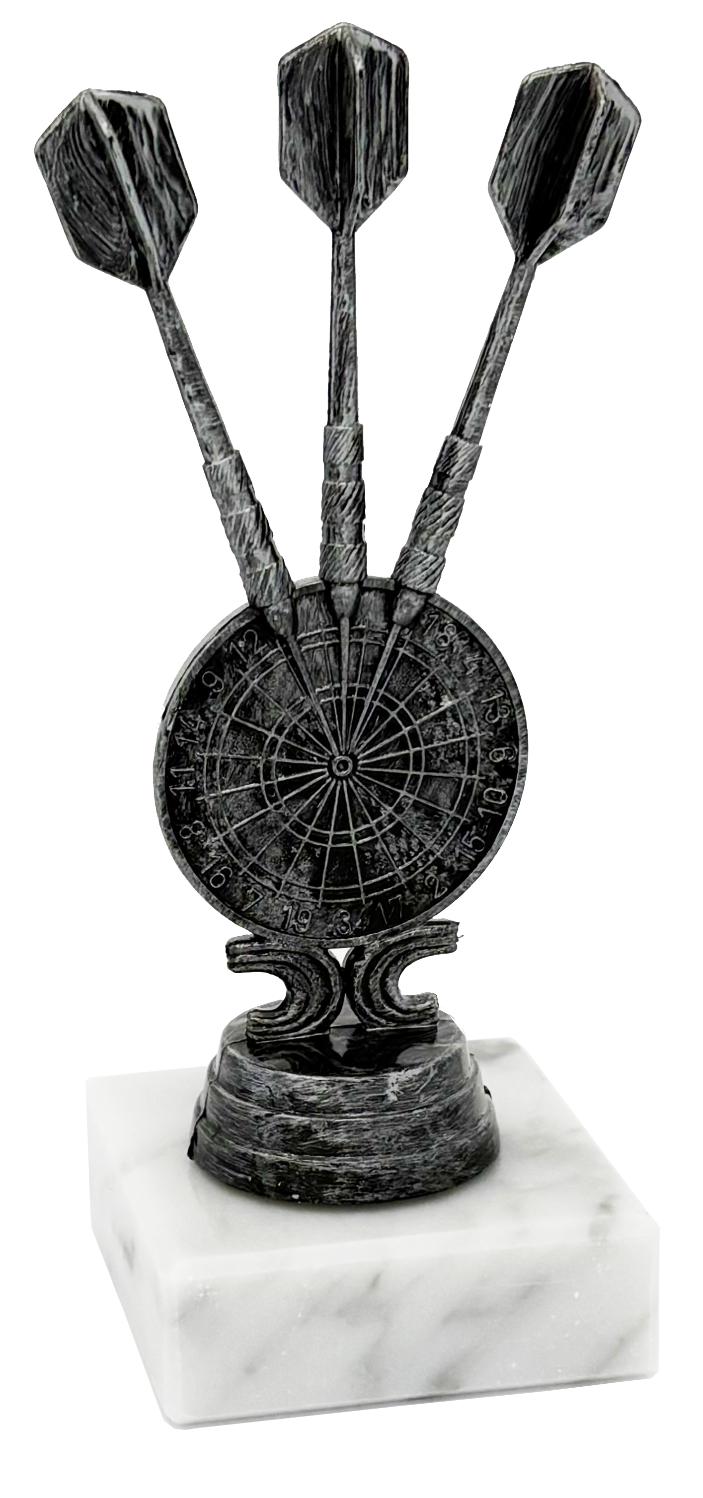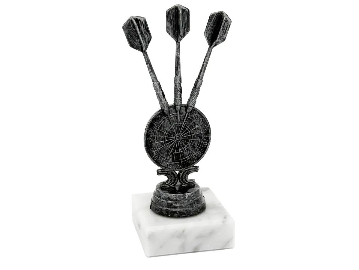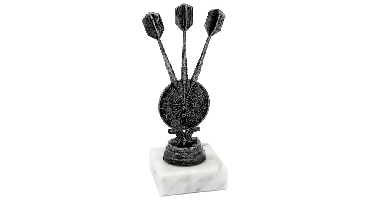 Este trofeo de dardos es el premio ideal para torneos y competencias de precisión. Con un diseño detallado de una diana con tres dardos en relieve, representa la destreza y puntería de los mejores jugadores. Su acabado en tono plateado le otorga elegancia, mientras que la base de mármol brinda estabilidad y sofisticación.