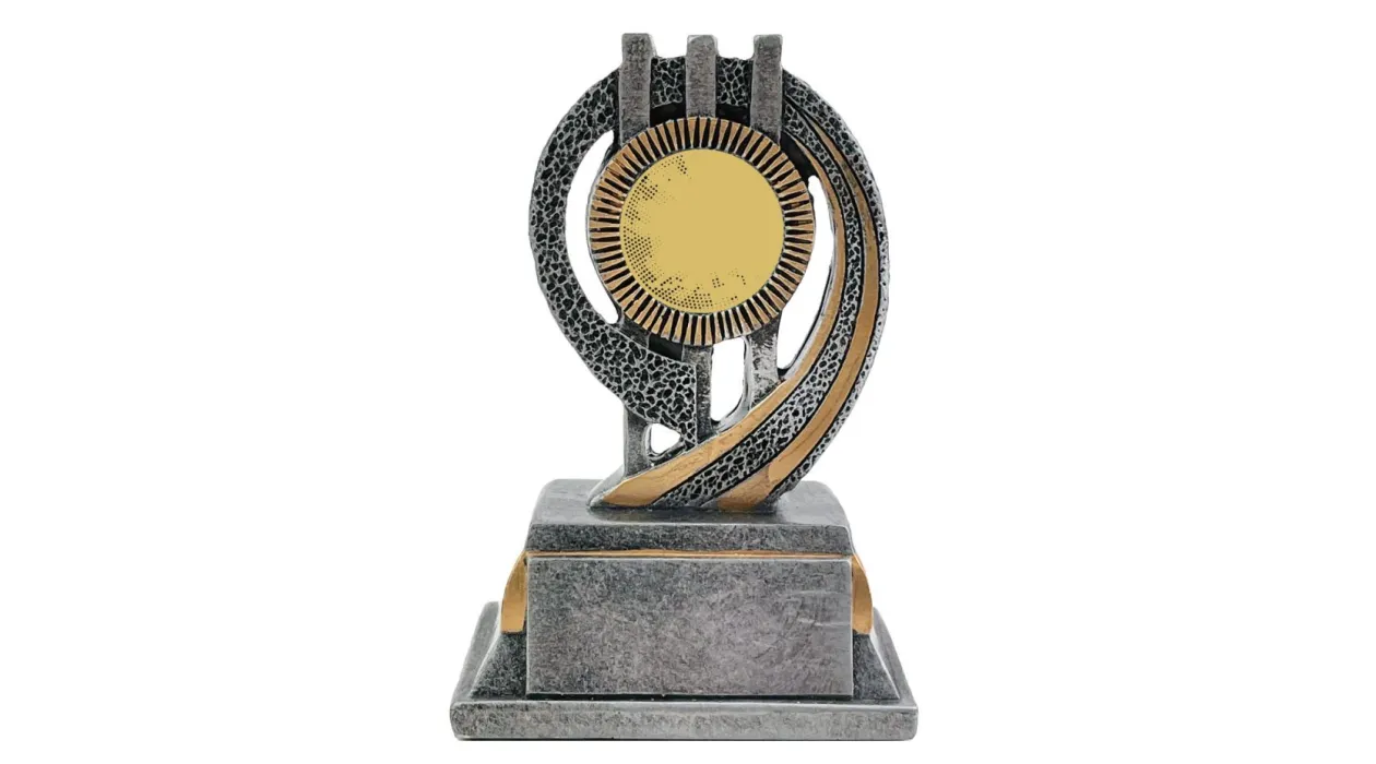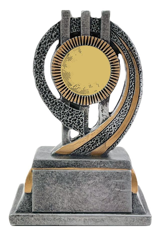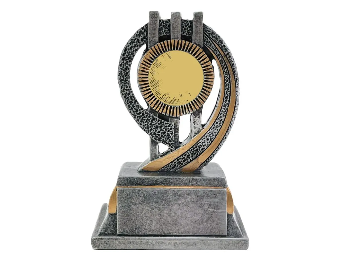 Este es un trofeo moderno con un diseño abstracto, fabricado en resina con acabados en tonos plateados y dorados. Su estructura presenta una base rectangular con detalles dorados en los bordes, brindando un aspecto elegante y robusto.La parte superior del trofeo tiene una composición artística que combina texturas rugosas y lisas, con líneas curvas y rectas que enmarcan un círculo dorado central. Este círculo puede representar el sol, la excelencia o un logro destacado.Este trofeo es ideal para premiaciones en eventos deportivos, corporativos o académicos, destacando por su diseño contemporáneo y llamativo.