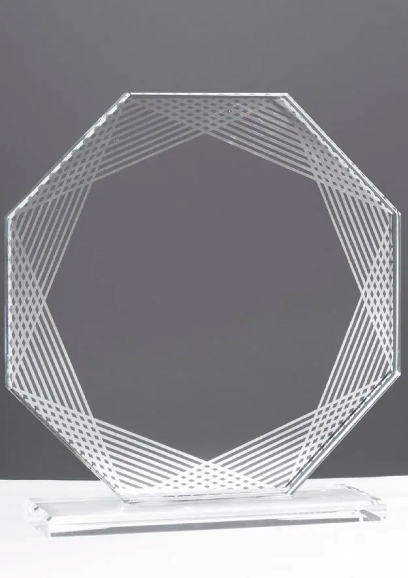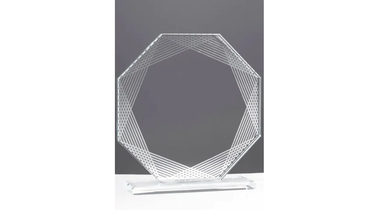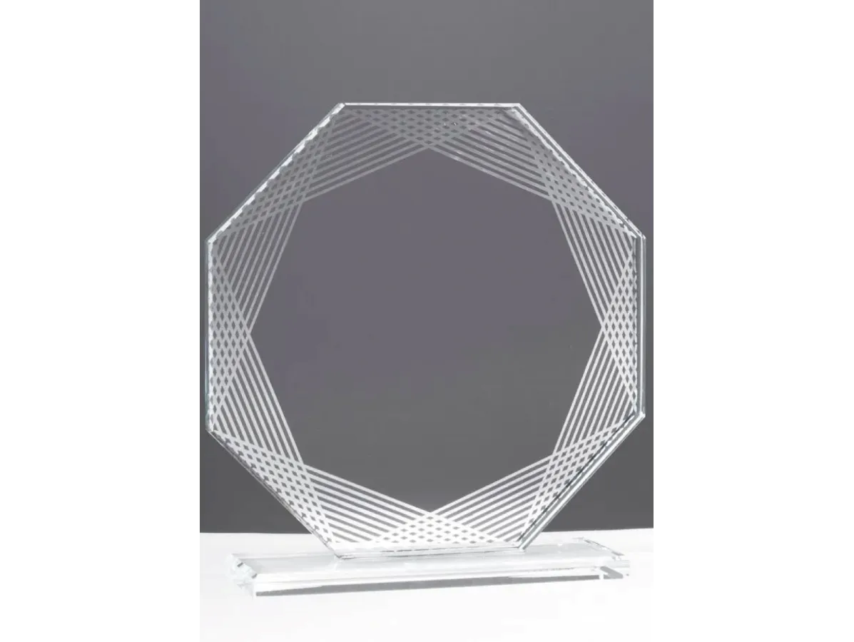 El trofeo octogonal de cristal es una pieza de reconocimiento elegante y contemporánea, ideal para premiaciones empresariales, deportivas y académicas. Su diseño geométrico con líneas grabadas aporta un toque de sofisticación y exclusividad.
